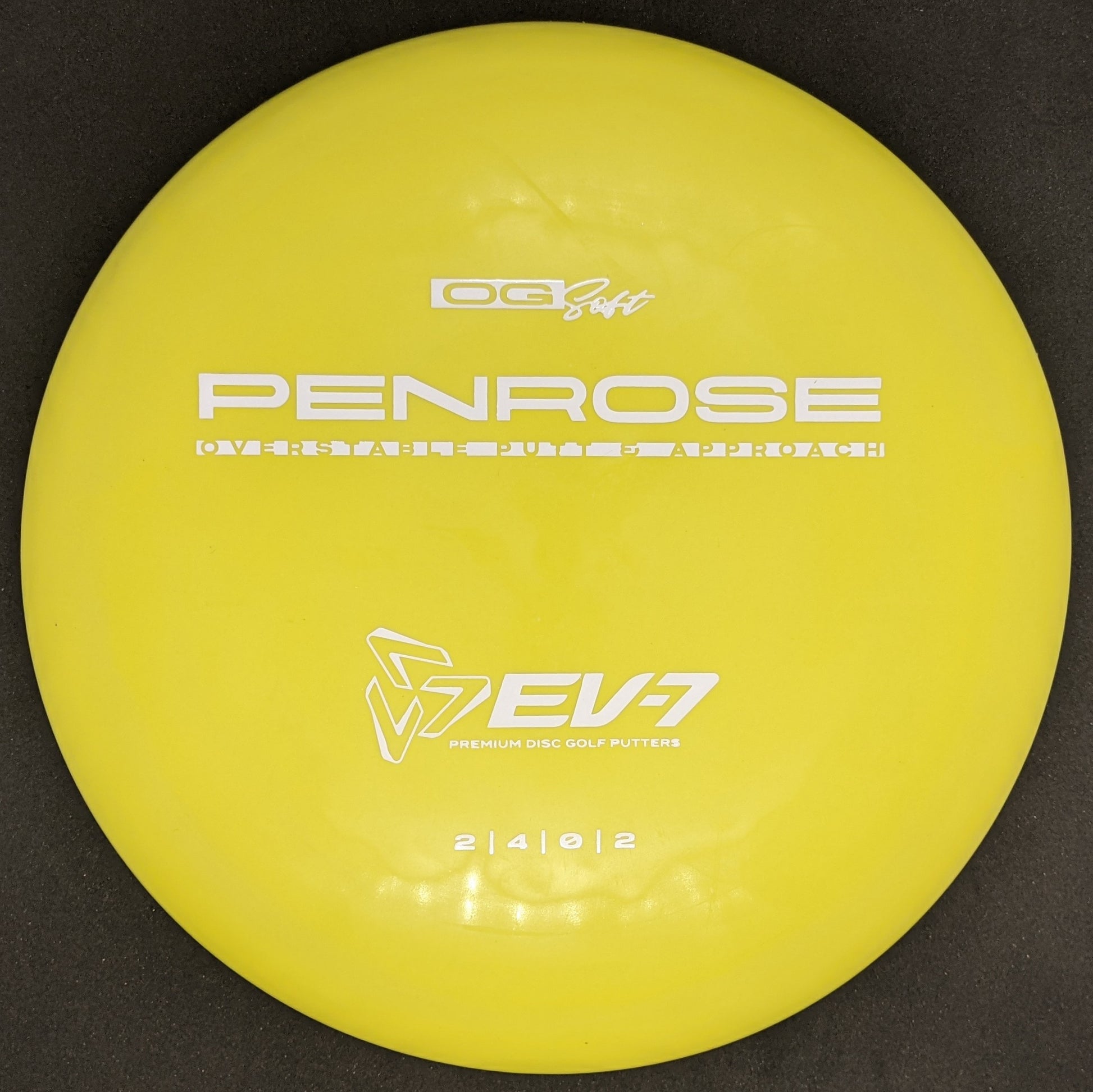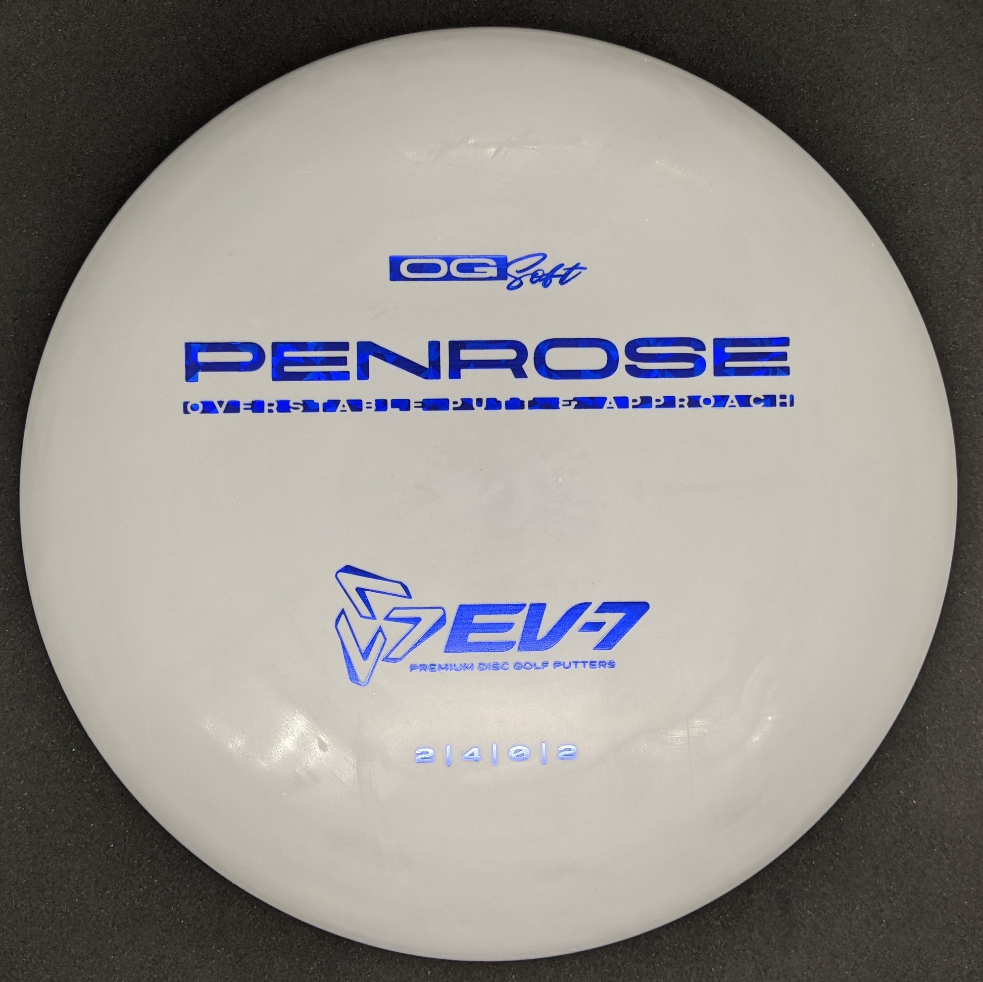 The Penrose is EV-7's debut putt and approach disc. It has reliable high-speed over stability and resistance to turn, but is uniquely straight with consistent fade at lower speeds on the putting green. With a slightly deeper profile, small bead, and smooth feel, the Penrose fits the hand comfortably, inspiring confidence for both putts and approaches.