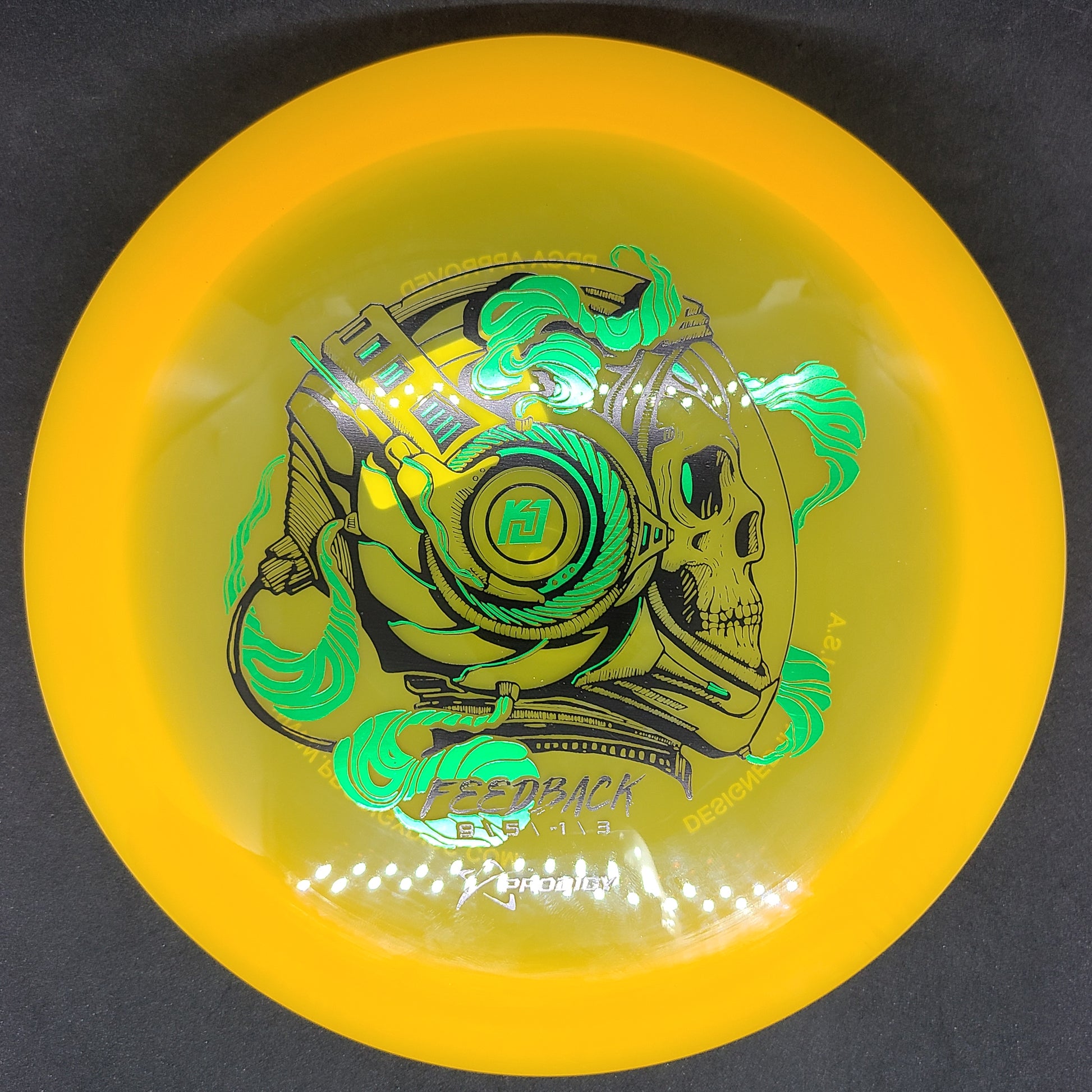 The Feedback is an overstable fairway driver developed with Kevin Jones as part of the Prodigy Collabs Series. As controllable of a disc as they come, the Feedback can hold a line with little movement left-to-right for the majority of its flight before a dependable fade helps you hit your landing spot. It can withstand a windy day and players will notice a broken-in feel fresh from the factory.