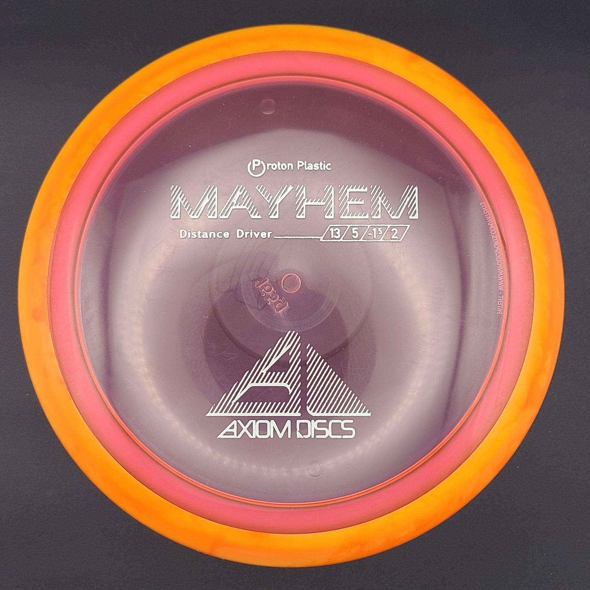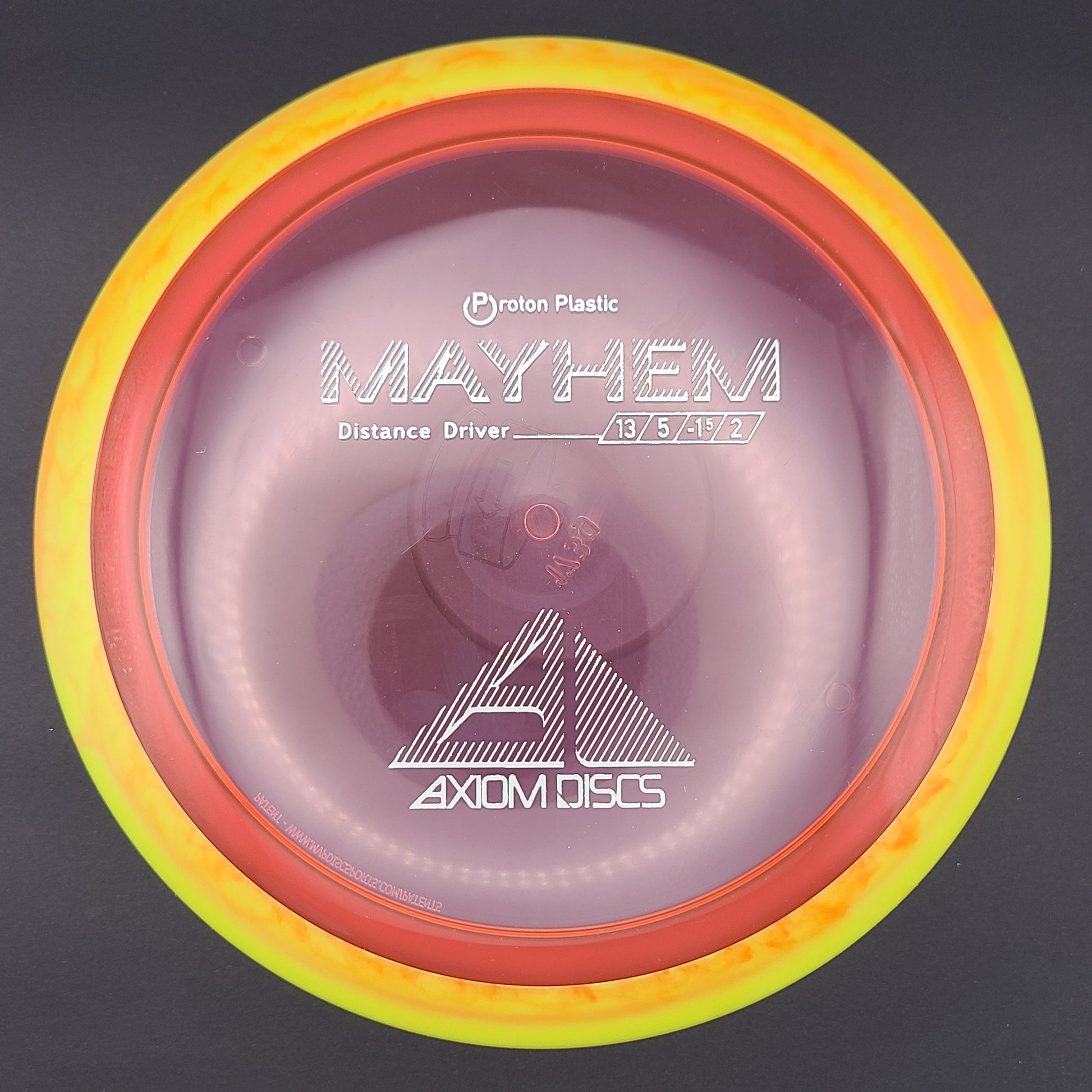 Mayhem has a responsive straight-stable profile and plenty of speed, making it a perfect workhorse driver for many advanced and expert throwers. Like the MVP 23mm class, the Mayhem has a pronounced dome to promote distance-covering glide. Mayhem is best compared to a beat MVP Octane.