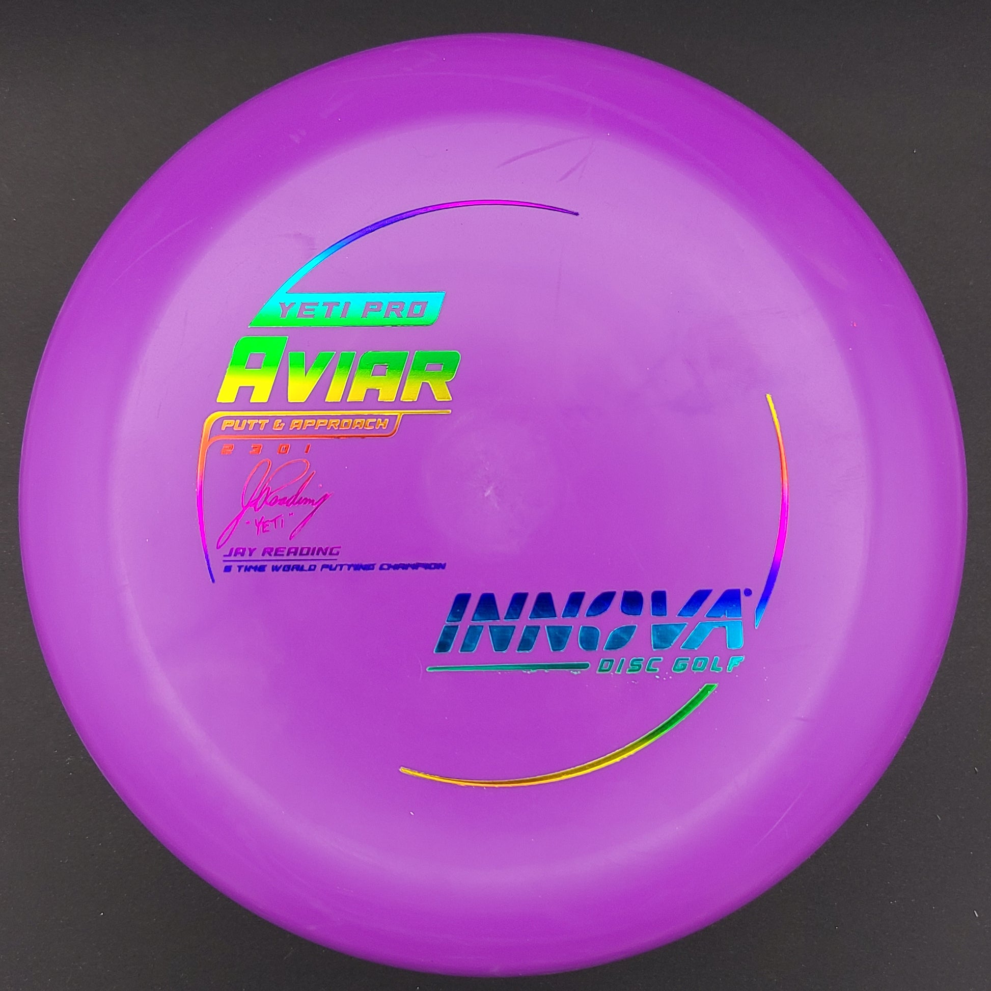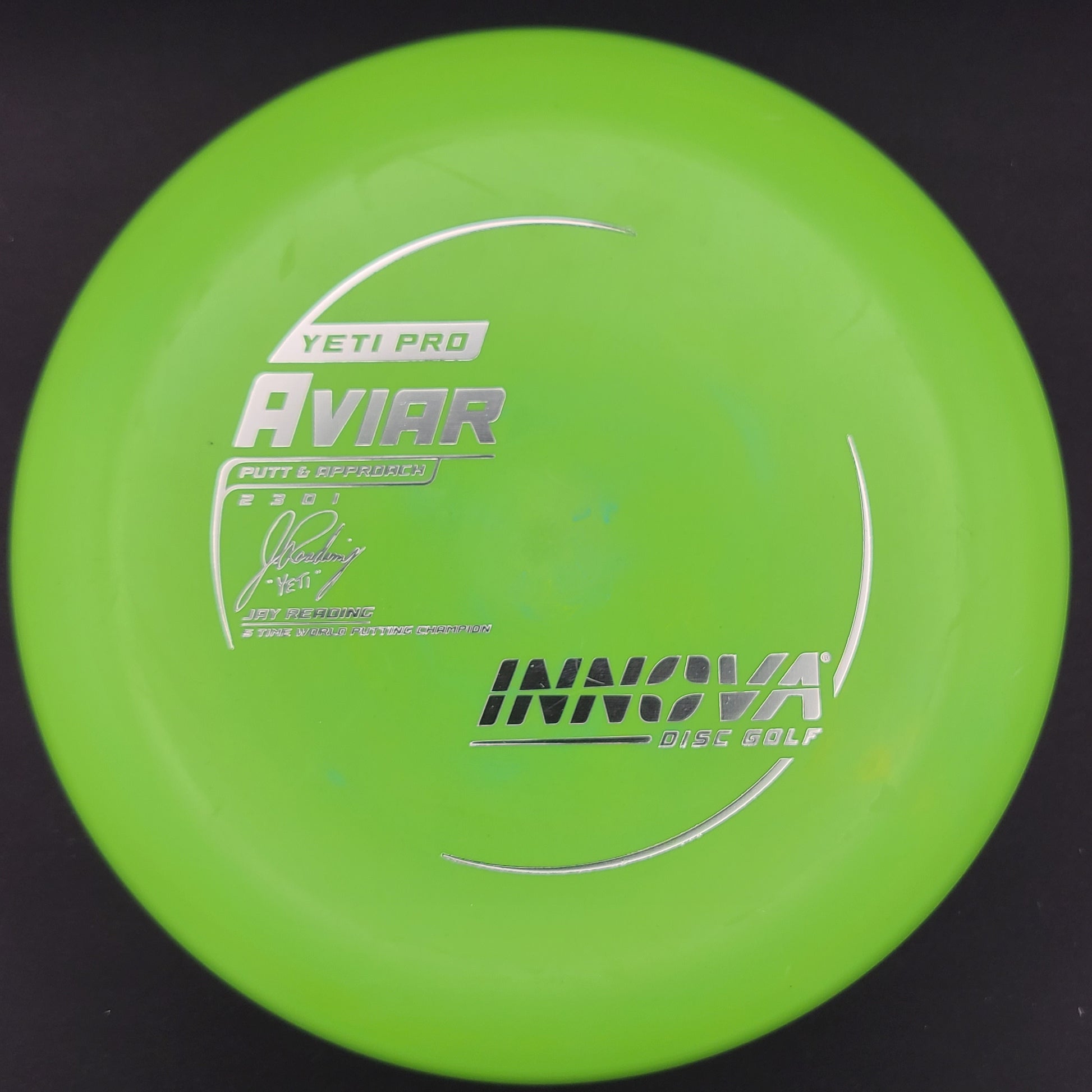 The Yeti Pro Aviar is a straight flying putter that works well on the course too. Innova developed the Yeti in a firm, grippy blend of Pro blend of plastic. It's somewhere between DX and R-Pro in both grip and firmness. The unique slightly concave top allows for a lower profile and a straighter flight than our other big bead models (KC Pro, JK Pro & Aviar Driver). The grippy firm plastic feels great in your hand in any weather.