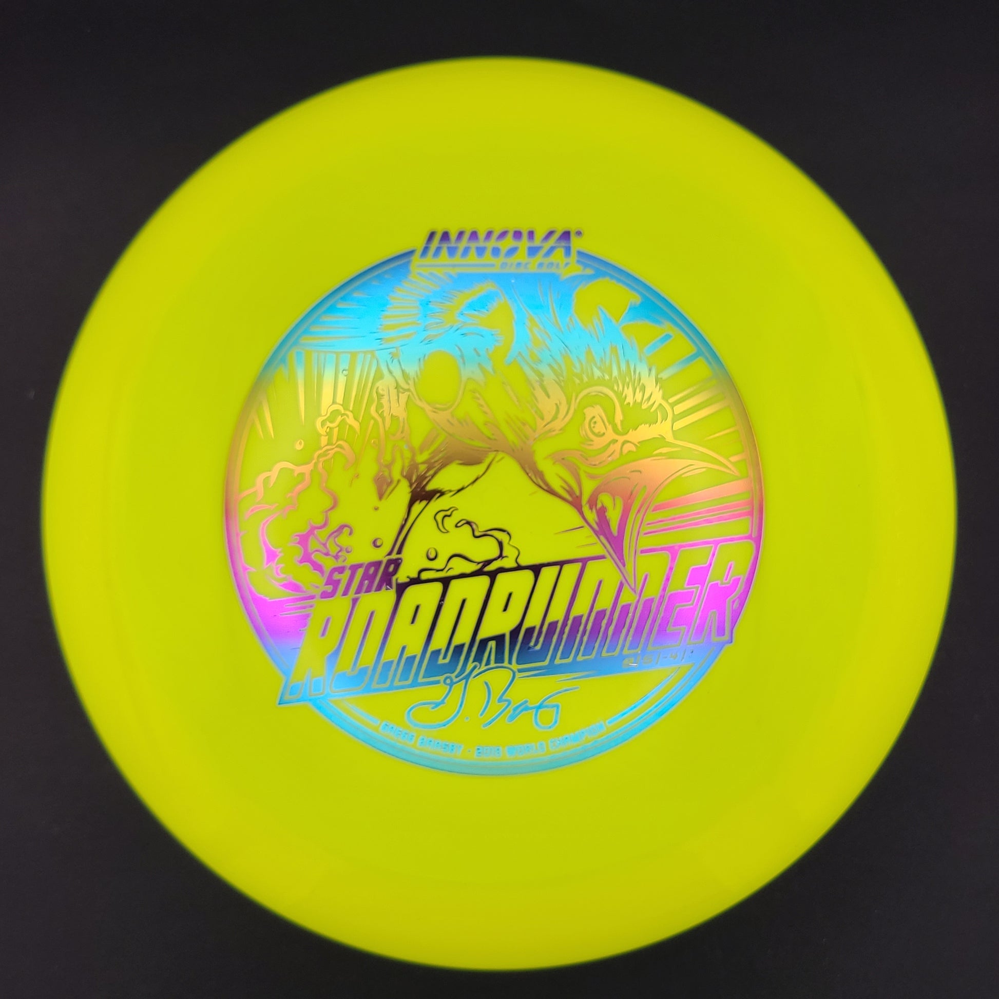 The Roadrunner is a long-range distance driver with lots of glide. It makes an excellent finesse driver or long range roller. Power throwers can use this disc for long turnover shots and rollers. Less powerful throwers can use this disc for long, straight shots or low tunnel shots.