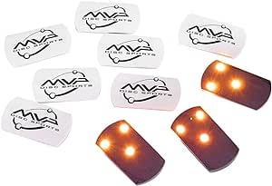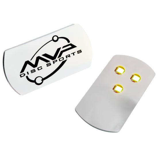 Lumières LED par MVP Disc Sports. Ces unités micro LED sont conçues pour être collées au centre d'un disque pour une lecture nocturne, mais peuvent être utilisées de diverses manières créatives. Un bouton situé au centre des LED sous le couvercle du circuit avec logo MVP imprimé permet d'allumer/éteindre le dispositif.