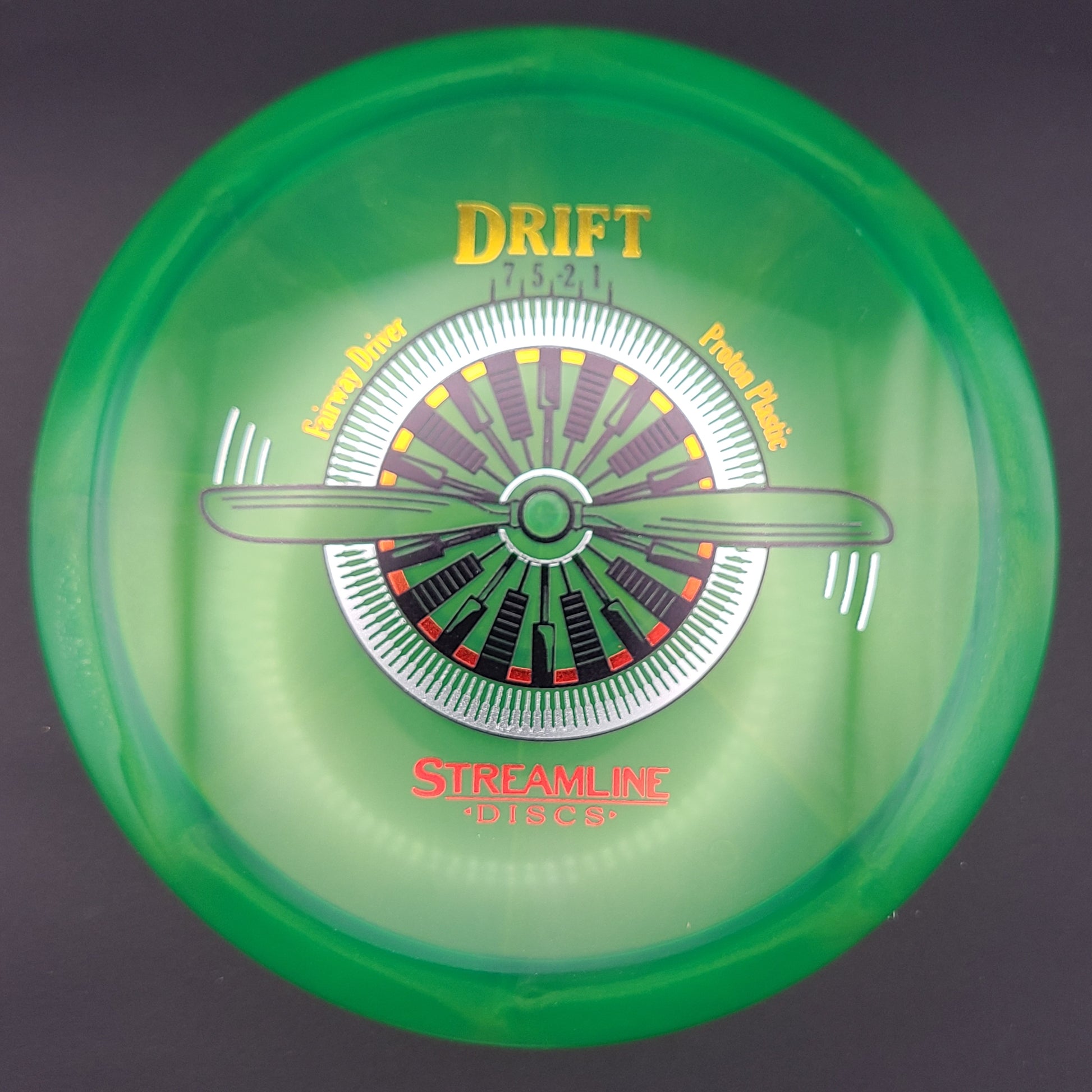 Le Drift est conçu pour les lignes droites laser se terminant par un léger fondu et une quantité exceptionnelle de glisse, offrant une distance facile avec ce driver très polyvalent. Le Drift a une taille de jante modeste, un profil légèrement bombé et un virage facilement activé pour les hyzer-flips ou les gros coups de rotation. Le Drift fera ses grands débuts en plastique Neutron, se mariant parfaitement avec ses couleurs opaques vives, sa durabilité et son adhérence. Ce driver Speed 7 est le premier driver de fairway de la flotte Streamline et poursuit la tendance des superbes tampons triple feuille.